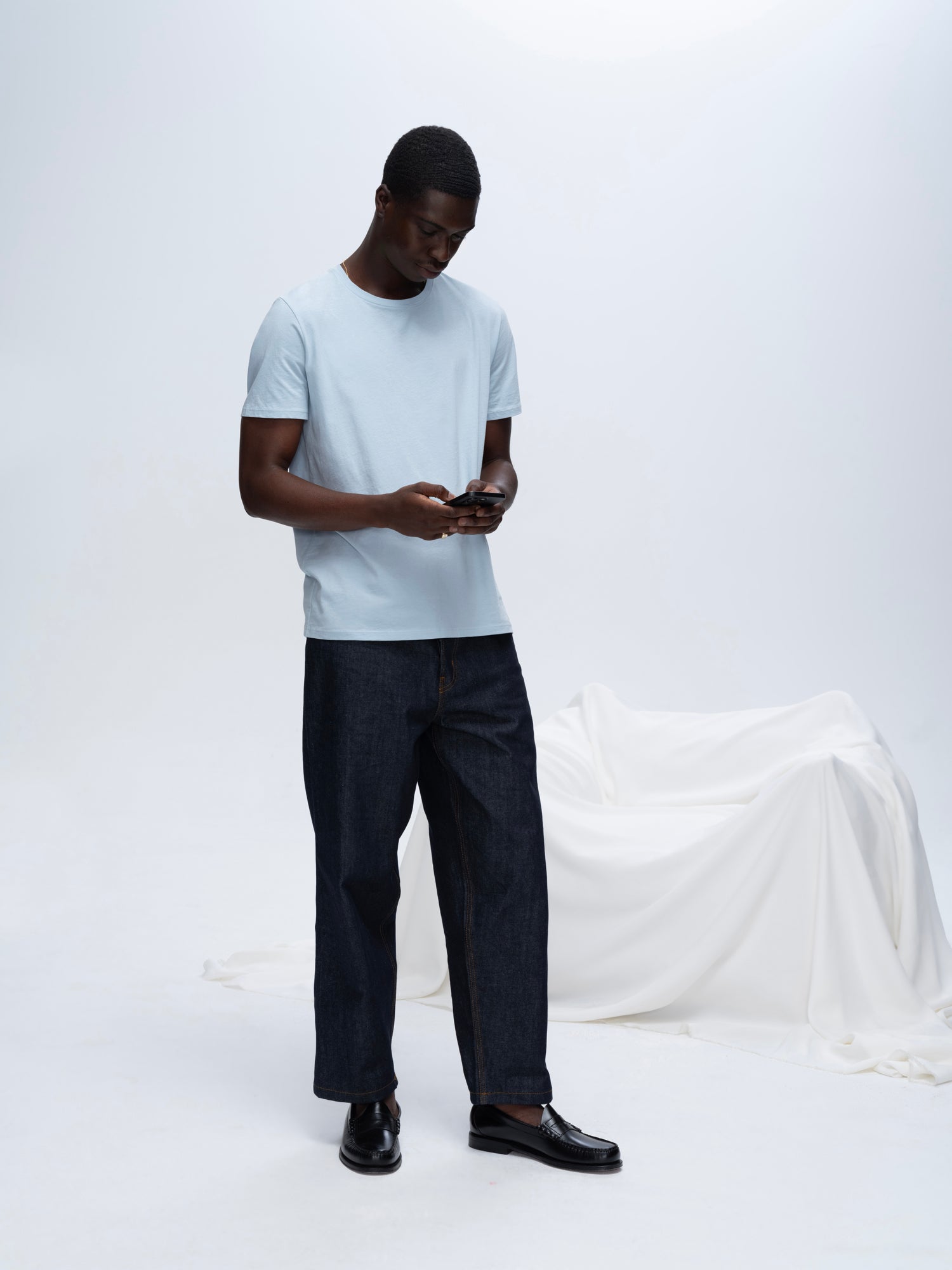 The Classic Jersey Crew Neck Tee features a banded neckline and a slightly fitted silhouette. The modest drape. straight cut hem and meticulously measured neckline offer an elevated take on the classic silhouette.